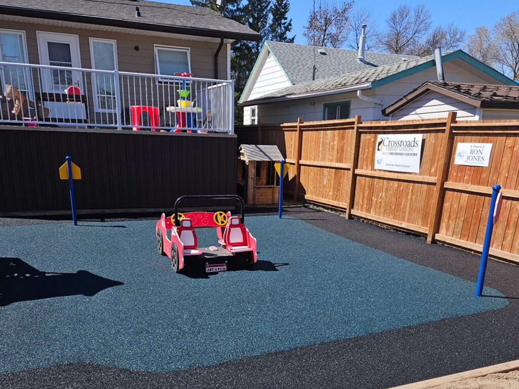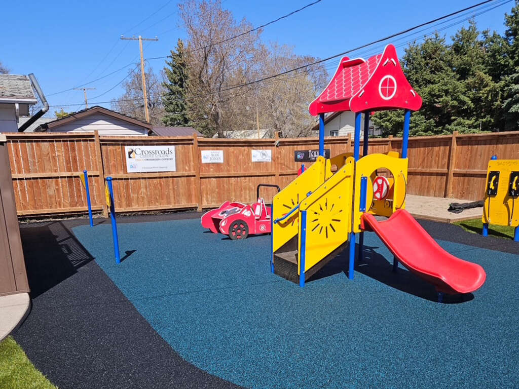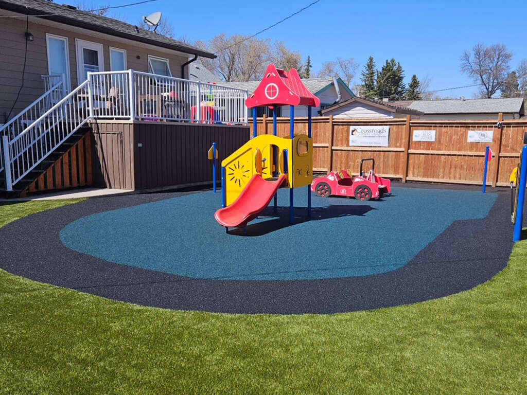 This playground was specifically designed for the little ones at Wadena daycare. The poured rubber trike path with road signs and a gas pump panel is sure to keep these children happy and busy for hours on end. The addition of a jr. sports car adds a finishing touch to make this an area of endless fun! Surrounded by turf, the grass never needs mowing. The play area will stay clean and manicured with very low maintenance required.